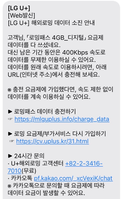 충전 후에는 문자로 충전 완료 안내가 오고, 데이터 사용 시작일과 종료일을 확인할 수 있습니다. 해외 현지에서도 앱을 통해 남은 데이터 확인과 추가 충전이 가능하므로, 갑작스럽게 데이터를 다 쓰더라도 즉시 충전이 가능합니다.