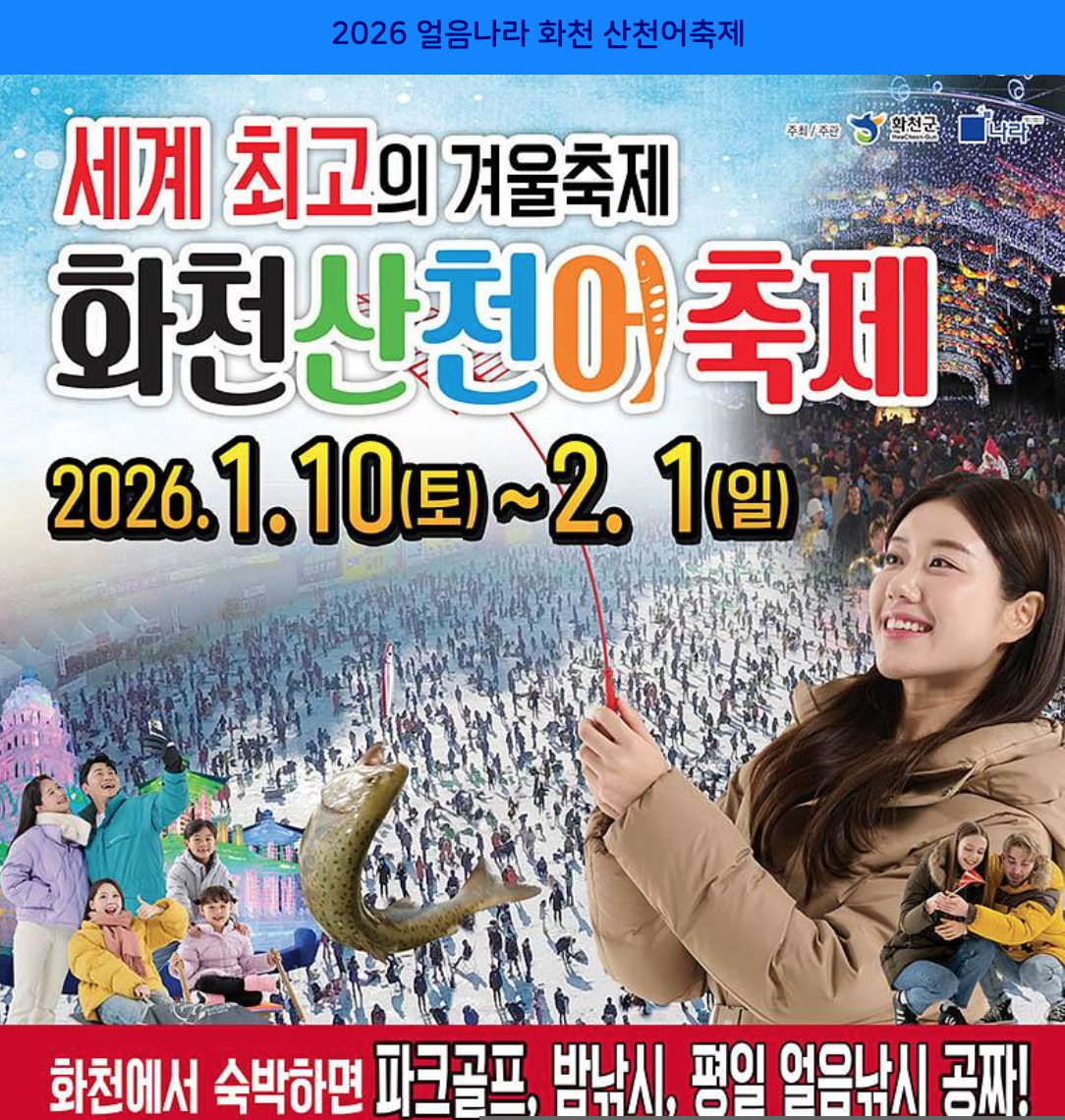 강원도 화천산천어축제(1/10~2/1)는 얼음판 위에서 송어를 잡고 즉석에서 회로 맛보는 진짜 겨울 체험입니다. 매년 열리는 이 축제는 외국인 관광객에게도 인기이며, 아이들과 함께 즐기기 좋은 가족형 행사입니다.