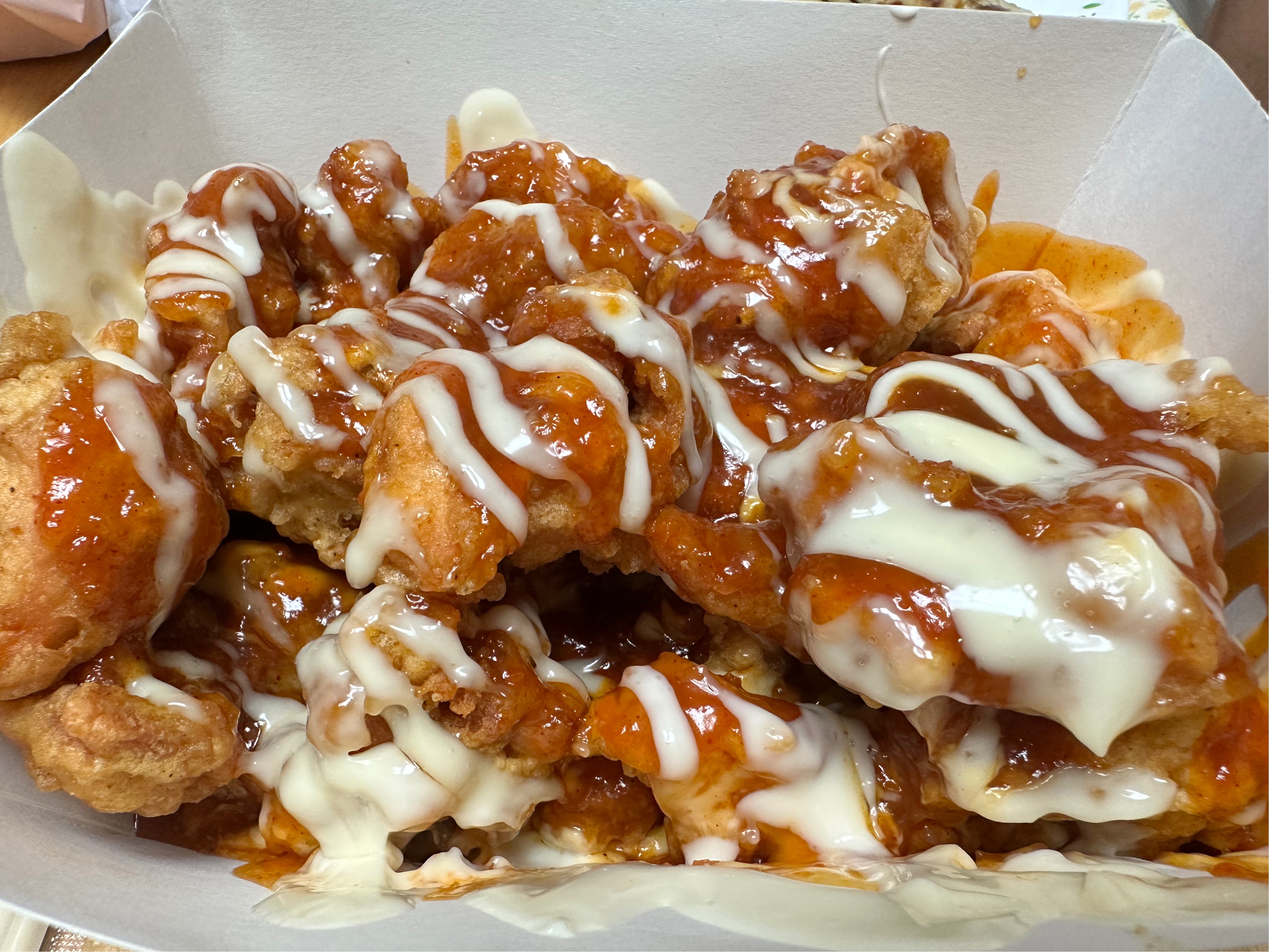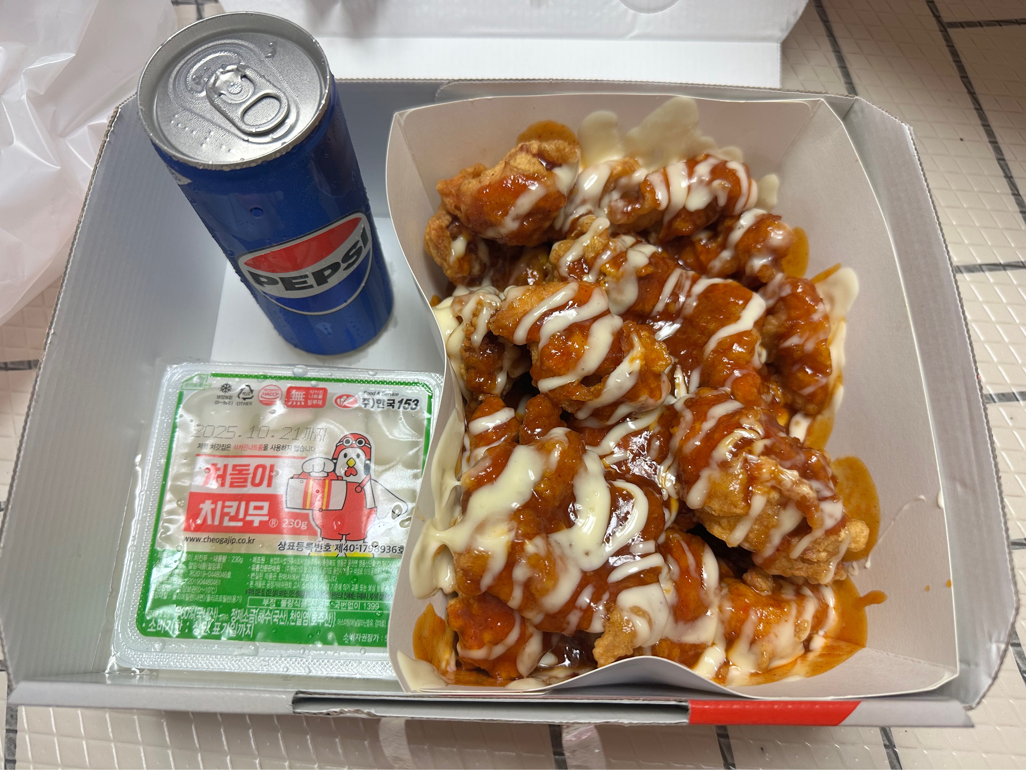 처갓집 양념치킨은 약간 매콤한 맛이 도는 반면, 슈프림 양념치킨은 마요 소스와 치즈 덕분에 맵지 않고 달콤한 쪽에 가깝습니다.
