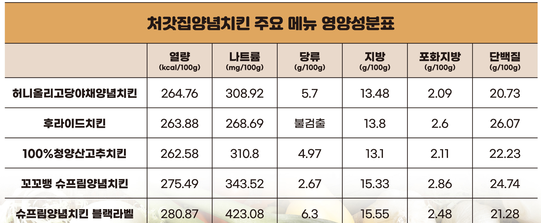 · 양념치킨: 깔끔한 매콤달콤함, 상대적으로 낮은 칼로리