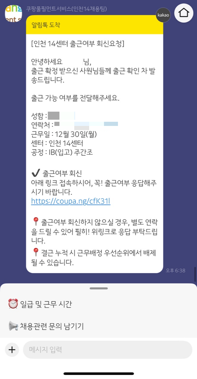 출근여부 회신요청 카톡시간 오후 6시 34분