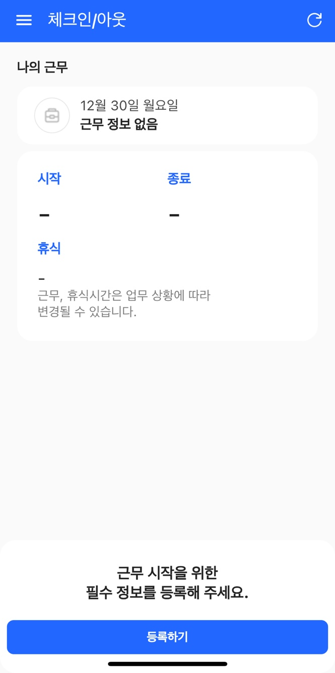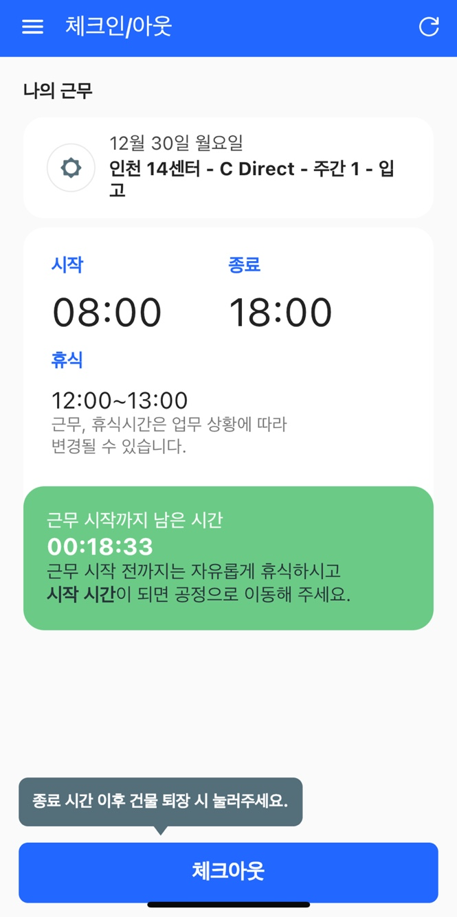 근무시작인 08:00시까지 체크인을 해야 합니다.