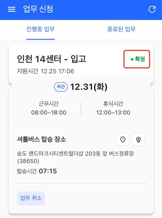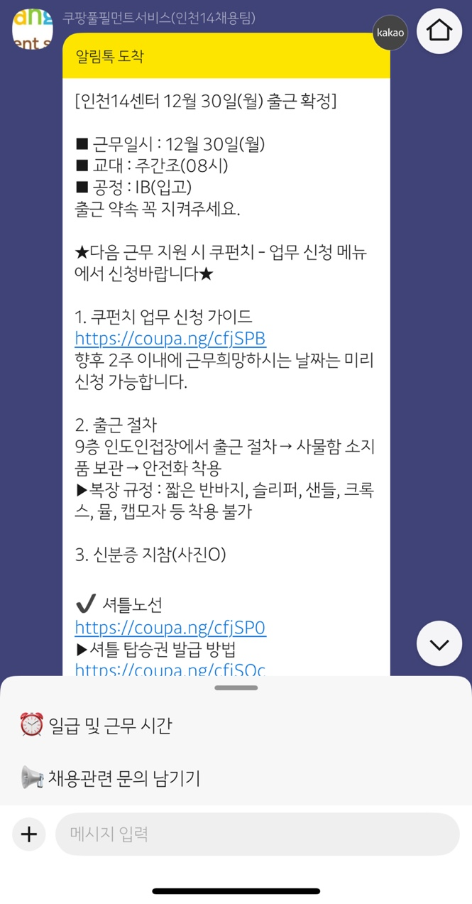 쿠펀치 어플→ 업무신청→ 출근 확정 카톡→