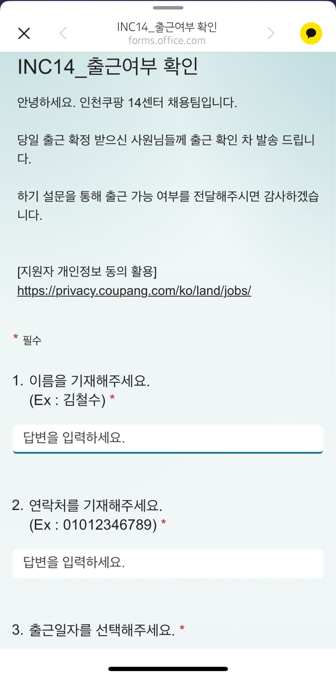 출근여부 회신 링크 접속하여 출근여부 응답→