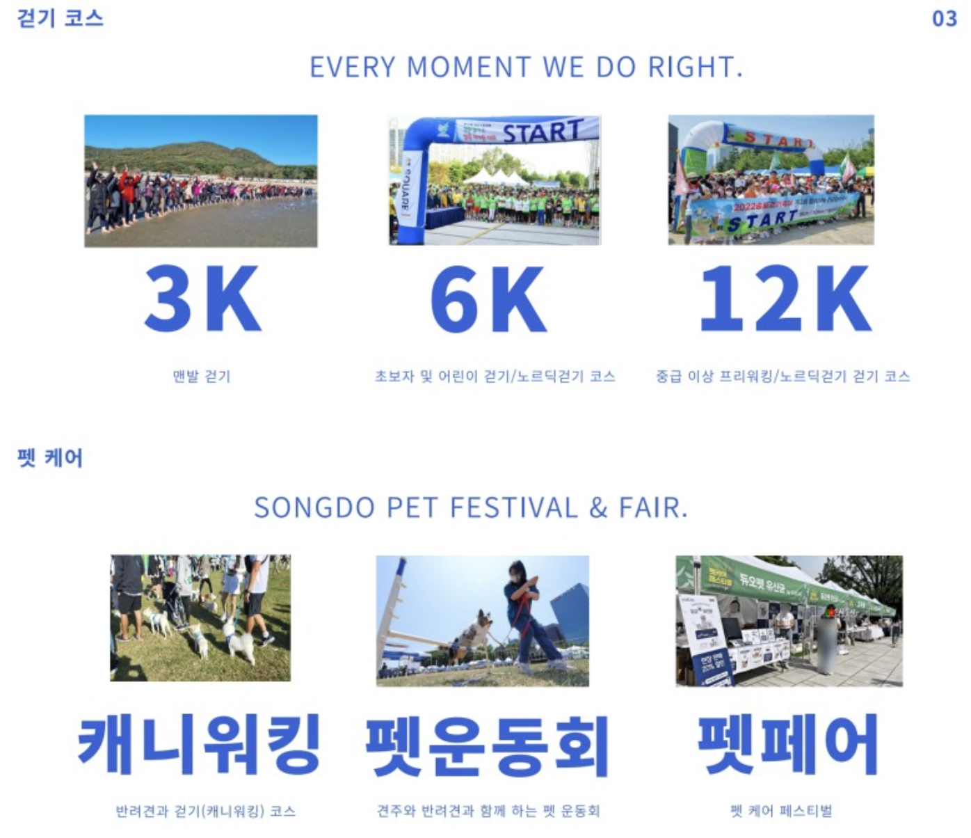 걷기 코스는 3km , 6km, 12km이며, 어린이 걷기는 6km입니다. 댕댕 트레킹은 3km, 6km가 있습니다.
