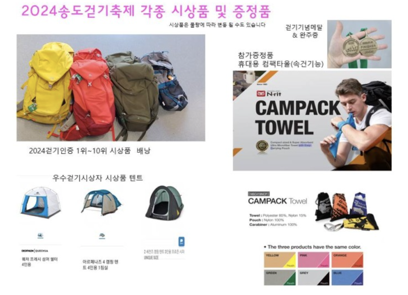 시상은 2024년 전체기간 1위부터 10위까지 시상합니다. 네이버 밴드에 '건강생활'이라고 치면 나오는 연수구 걷기 인증하는 곳입니다. 이곳에 최다 인증한 사람순으로 시상됩니다. 걷기 축제의 참가자들에게 걷기 기념메달과 완주증 그리고 휴대용 타월을 증정품으로 줍니다. 그리고 시상품은 배낭과 텐트입니다. 아래의 사진을 참고해 주세요.