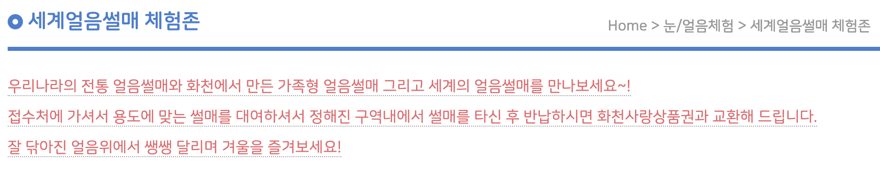| 구분 | 썰매종류 | 체험료 | 화천사랑상품권 제공 |