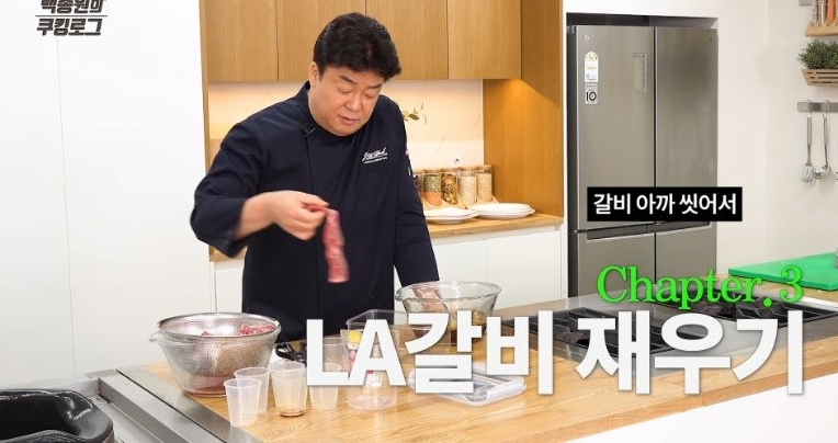 백종원식 LA갈비는 복잡한 과정 없이도 누구나 쉽게 만들 수 있다는 점이 매력입니다. 먼저 LA갈비 2kg을 찬물에 담가 30분 정도 핏물을 빼줍니다.